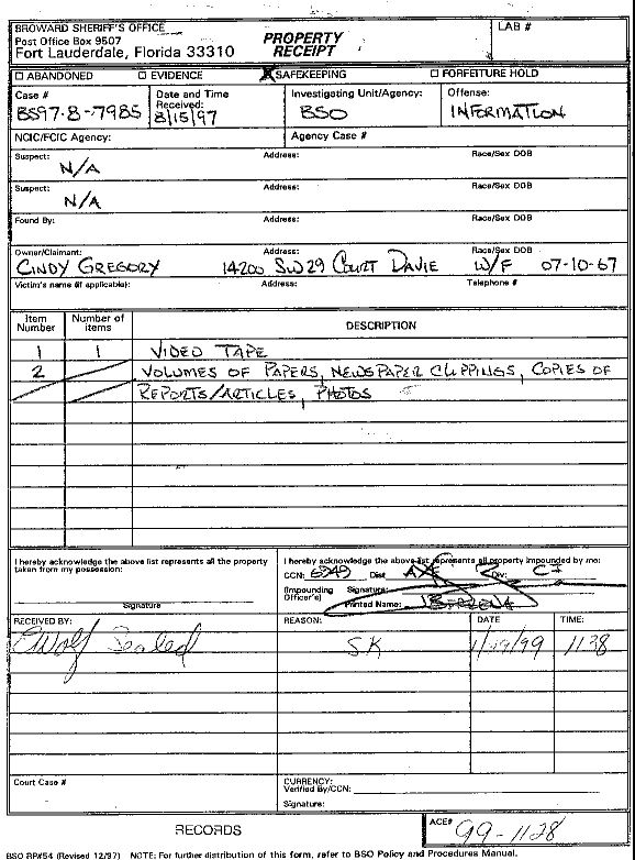 BROWARD SHERIFF'S OFFICE ( BSO ) HOMICIDE DETECTIVE JOHN BERRENA REMOVED LOGGED EVIDENCE (ACE# 97-12241) FOR OVER A YEAR, UNTIL AFTER A TRIAL. THERE IS NO REFERENCE TO THIS PROPERTY IN THE CHAIN OF CUSTODY, BUT THERE IS IN TRIAL TRANSCRIPTS AND IN STATEMENTS FROM OTHER BSO EMPLOYEES.