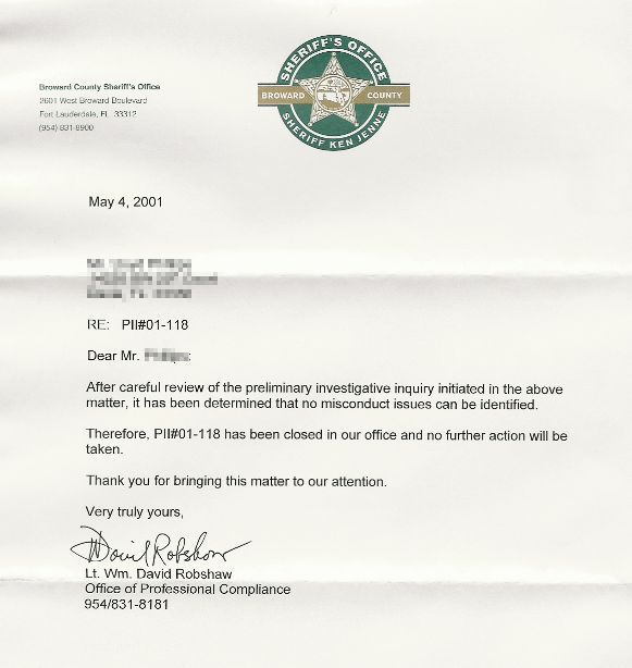 Carr was Homicide Detective John Berrena's boss, the BSO Detective who CONCEALED EVIDENCE. After the missing evidence was discovered, it was investigated by Sgt Carr, NOT the Internal Affairs Department. ALL NAMES AND DATES RELATING TO INTAKE WERE ERASED. Carr then photocopied my custody sheet. I immediately notified the SPECIAL PROSECUTIONS DIVISION of the STATE ATTORNEY'S OFFICE.